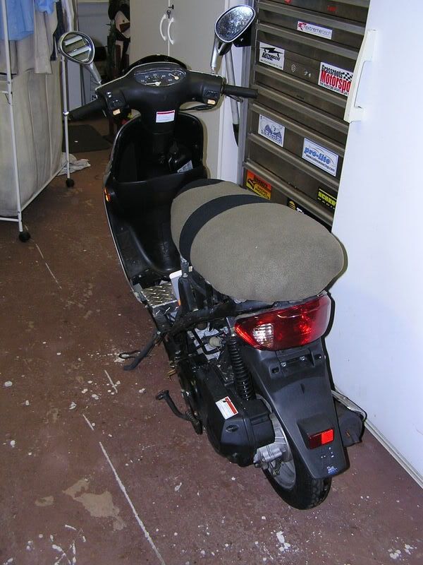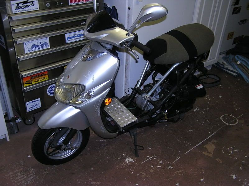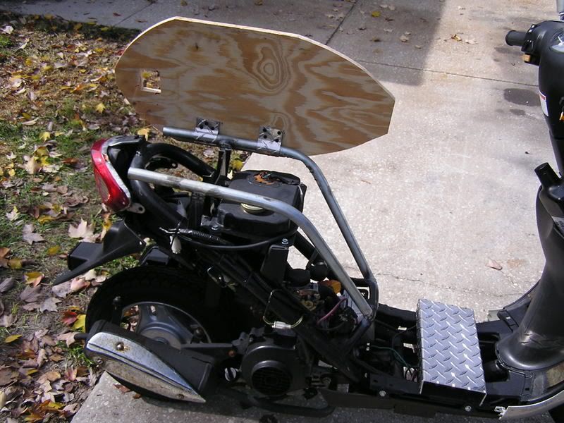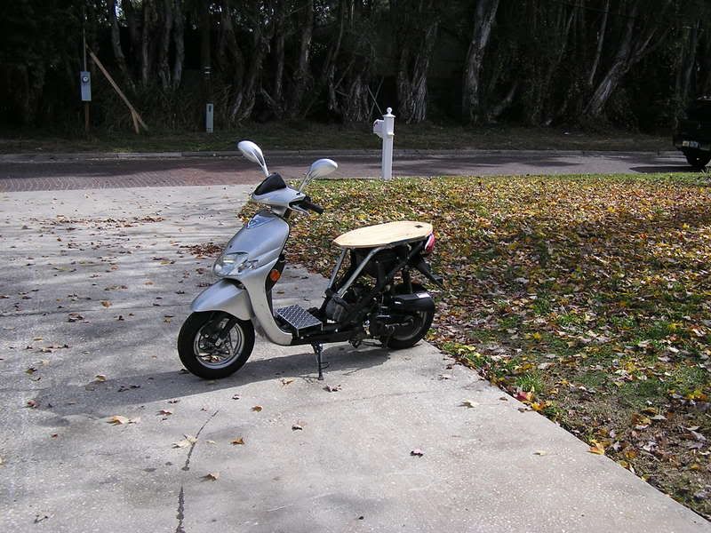 I bought a scooter. It was 50 bucks and is missing alot of pieces but it supposedly has a new engine and it has a title. I started making the seat. I just have to cover the plywood with padding and some material. I'm trying not to buy any parts and make everything from stuff in my garage. Here's some pictures.