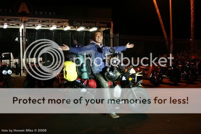 He joined the ruckus forums, and ended up meeting a ton of the members, staying with them, and getting free meals and scooter parts. he camped on the side of the road, or went to a bar to make friends when he couldnt find a place to stay.