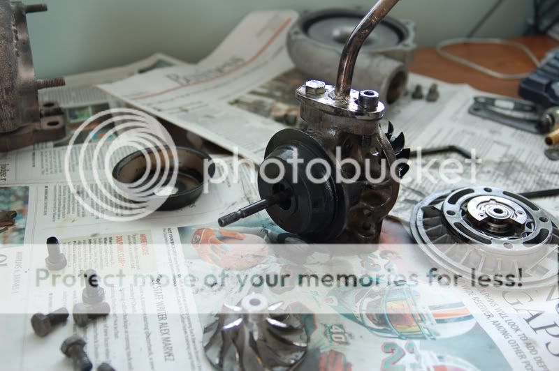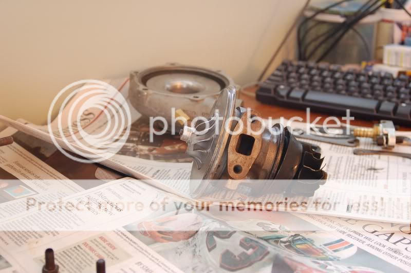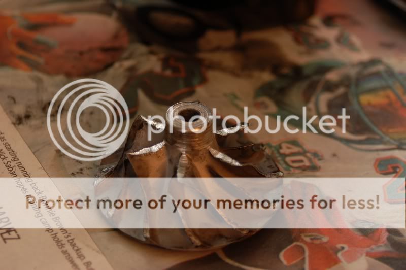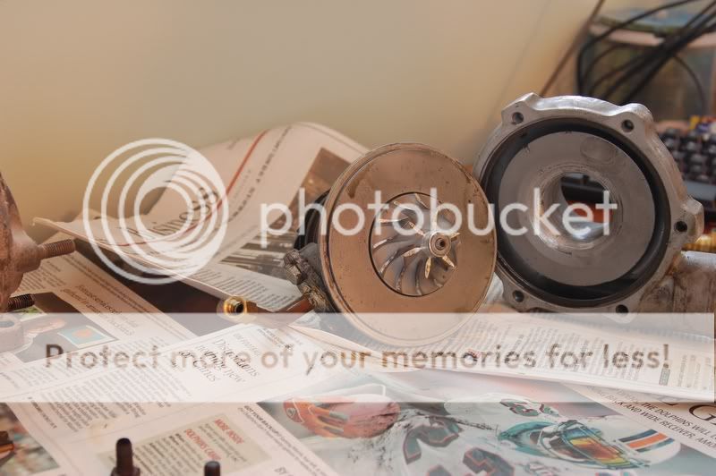 then 100 miles later i get a whinning noise, like metal on metal. now i cant spinnit by hand. Eventually i take the turbo abart, expecting a bearing problem, a destrooyed seal, or a bent shaft. my finding reveal nothing of the sort. so i my new conclusion is becaause i had so much shaft play,an that the the compresser spline is missing a nut or something, that the turrbo was boucing off either side of the housing. thus when it is stuck to one side i can spin it.