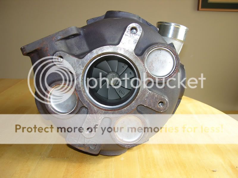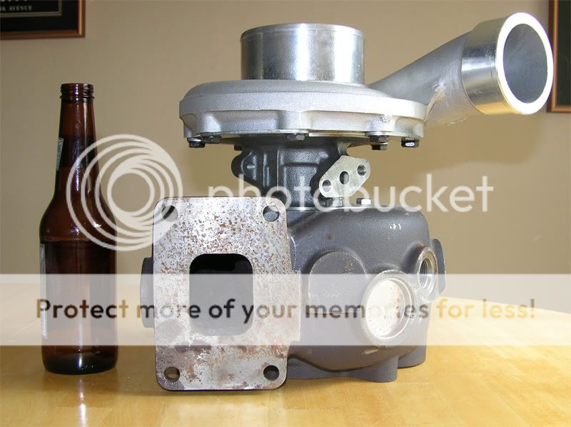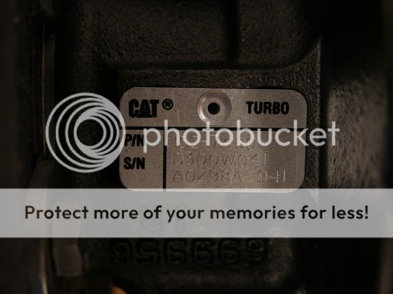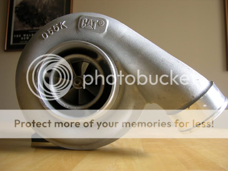 This guy kept asking me if I wanted to trade him anything for my JDM-HAWTNESS side windows, and I kept saying no. I wanted $150 for them, but then he started telling me about these brand new ball-bearing turbos he had laying around. Caterpillar Marine "big suckers" and he wasn't kidding. So the coolness factor made me trade with him, one brand-new turbo. I want to get some information so I know what to post on E-bay when I try to sell them, but I cannot find any information about them...but I am going to call Caterpillar. I do know it is marine turbo and has liquid cooled turbine housing, pretty sweet, and weights 46lbs.