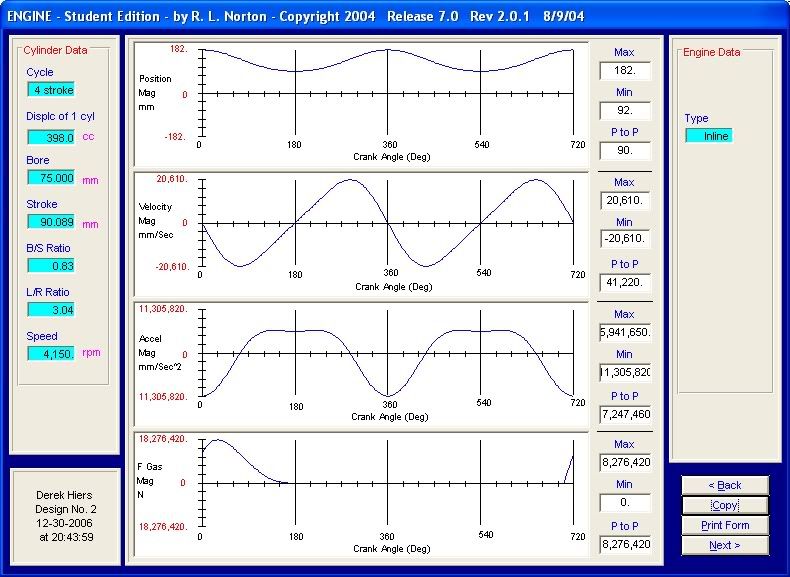 the first is a graph of the piston position, then piston velocity, then piston acceleration. the first 3 are pretty basic, the velocity is just the derivative of position and acceleration is the derivative of velocity. If you dont know what a dereivative is just look at it and think about whats going on and it makes sense. The last graph is te wristpin force. Its high at the beginning because thats the combustion phase. These came from a prgram out of one of my books from last semester. Pretty cool cause you can mess with bore and stroke ratios and see how it affects it.