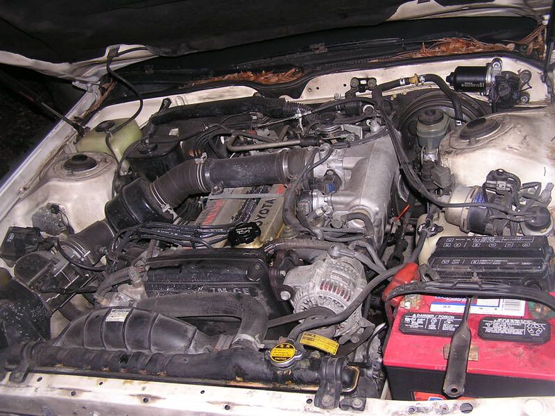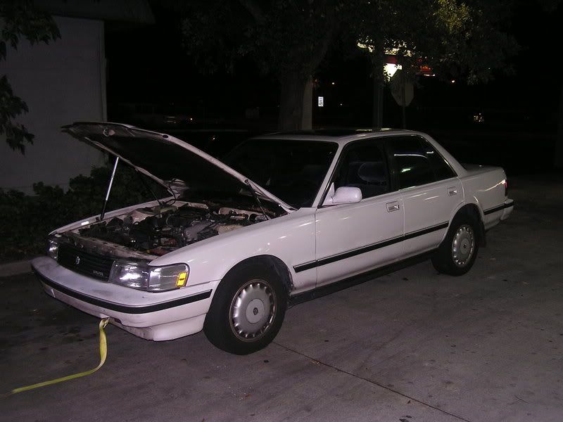 My friend Tom called me up last night and told me he got this car for free but we had to go tow it off the interstate that night. Its a 89 Toyota Cressida. We went out there and popped the hood and took a look. My first thought was "2 JayZ's????" but then I realized its a 7m and the car is RWD. We towed it back and looked at it. The problem is either a bad battery or broken timing belt or something. The rest of the car is in good shape.
