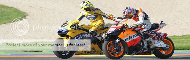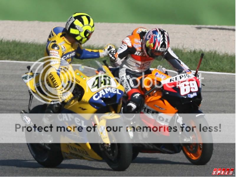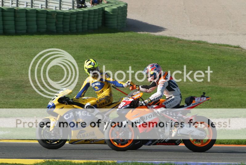 So last race at Valencia, 4th lap. Across the line it goes Bayliss, Capirossi, Hayden, Pedrosa, and Rossi after a sh!t start by Rossi which put him 3rd to 8th at turn one. Halfway through the lap with Rossi pressing hard but with Rookie Chris Vermeulen on his ass, his front end tucks and he ends up in the gravel. Loses 45 seconds and Hayden takes his time on his way to the Championship (took 3rd place). So the pictures are taken right as Rossi catches up to congratulate Hayden after the race.